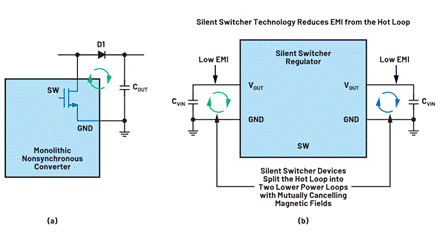 圖1. (A) 異步單芯片升壓轉換器具有單個熱回路,其中包含一個外部續流二極管。(b) Silent Switcher轉換器具有兩個(相反)熱回路和全集成開關。