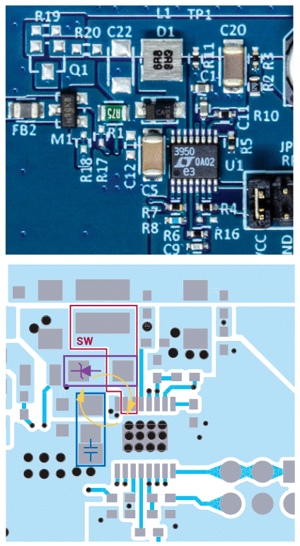 圖2. LT3950 (DC2788A)異步熱回路包括D1續流二極管。盡管如此,續流二極 管和輸出電容仍與LT3950 16引腳MSE封裝緊密貼合。突出顯示的異步開關 節點小且緊湊,但并非不可能。開關節點的布局可能是實現低輻射結果的關鍵。