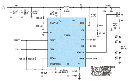 圖3. LT3950 LED驅動器是一個異步單芯片1.5 A、60 V升壓轉換器。升壓轉換器熱回路(黃色突出顯示)包含一個分立式續流二極管,不會減弱高頻率輻射。