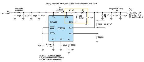 圖4. LT8334 40 V、5 A異步單片式升壓IC被用于SEPIC應用中。SEPIC轉化器熱回路(黃色突出顯示)包含一個分立式續流二極管和一個耦合電容,不會減弱輻射。