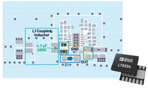 圖5. LT8334單芯片40 V、5 A異步開關,集成到微型4 mm × 3 mm 12引腳散熱增強型DFN封裝中。LT8334 SEPIC (EVAL-LT8334-AZ)的熱回路布局中包含這個微型DFN、一個陶瓷耦合電容、一個陶瓷輸出電容和一個小型續流二極管。