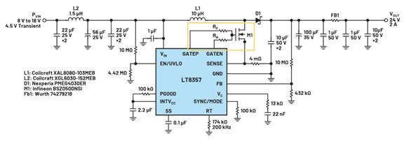 LT8357 大功率(異步)升壓控制器提供24 V、2 A (48 W),且輻射非 常低。它以低開關頻率為3.5 mm × 3.5 mm MOSFET供電,以實現高效轉換。除了緊密的熱回路(圖7)之外,它還通過上升和下降柵極控制引腳來實現邊緣速率控制和減少輻射。使用一個簡單的5.1 Ω電阻RP(在GATEP上)就足以降低M1功率MOSFET的開啟邊緣速率,并將電磁輻射騷擾保持在盡可能低的水平。當然,一些輻射濾波器和SSFM也有助于減少輻射。EVAL-LT8357-AZ評估板還額外留出了輻射屏蔽位置,但對于大部分應用,可能沒有必要。這個異步升壓控制器與它的單片式版本非常相似,具有高功率、低EMI升壓和SEPIC應用所需的所有功能。