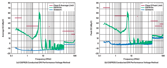 圖10. DC2788A LT3950通過了(a)平均和(b)峰值CISPR 25 5類傳導輻射測試(電壓方法)。