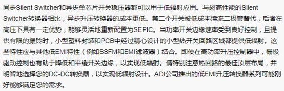 帶分立式續流二極管的異步轉換器仍然可以實現低輻射。如果在設計時特別注意熱回路布局和dV/dt開關邊緣速率,那么有可能使用異步轉換器實現低EMI開關應用。在展頻(SSFM)中集成降低輻射的額外措施是必要的。單芯片開關穩壓器,例如 LT3950 60 V、1.5 A異步LED驅動器和 LT8334  40 V、5 A異步升壓轉換器,每個都在器件中集成了單個低端電源開關,但它們依賴外部續流二極管,同時仍然可以實現低輻射!它的工作原理是什么呢?
