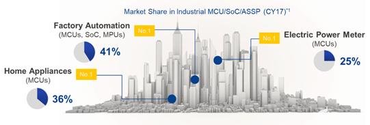 圖 1:瑞薩在全球工業 MCU/SoC/ASSP 市場的市場份額(2017 年)