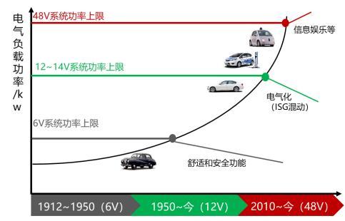 在電動車出現以前,汽車中的電壓都是非常低的。回顧燃油汽車的發展歷史來看,自1912年起至今的一百多年間,燃油車的功率僅從6V上升到了48V,