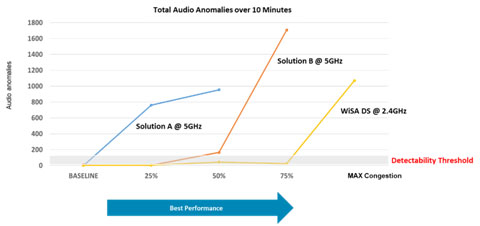 從歷史上看,在擁塞度為50%的環境中能夠運行的無線音頻解決方案即被認為是非常好的方案。WiSA的解決方案能夠在擁塞度為75%的環境中運行,是無線音頻技術的重大突破。
