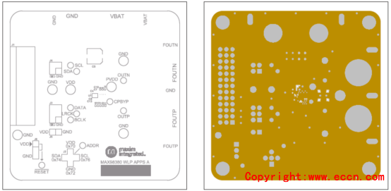 圖9. 評估系統MAX98380 EVS PCB設計圖:左:層5;右:底層絲印