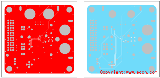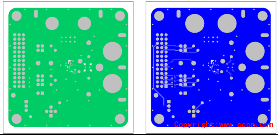 圖8. 評估系統MAX98380 EVS PCB設計圖:左:層4;右:底層