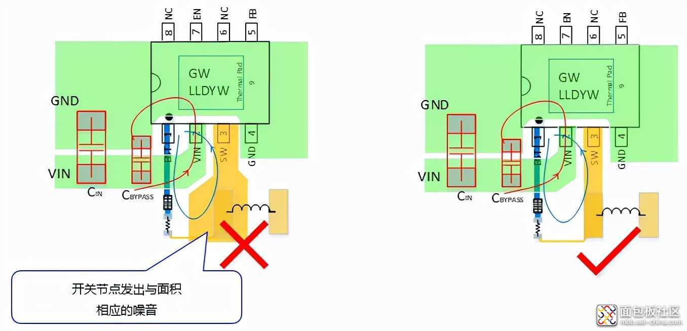 √ 關注芯片工作過程中的大電流環路,使其環路面積盡可能小。BUCK芯片尤其關注其輸入環路,BOOST芯片尤其關注其輸出環路