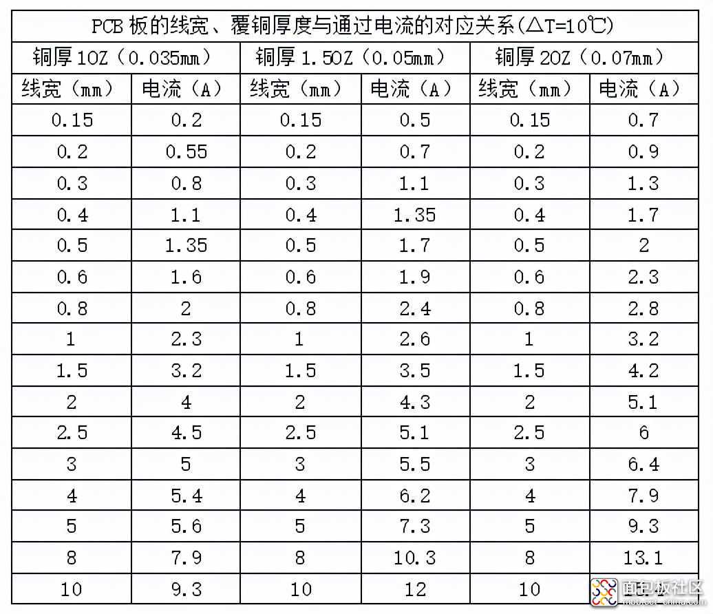 附上溫升10℃時,PCB板的線寬、覆銅厚度與通過電流的對應關系供參考。