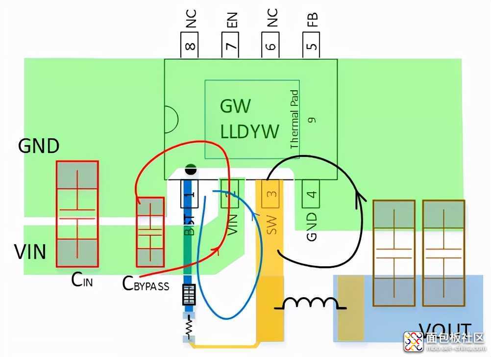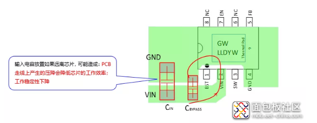 • 對于BUCK芯片而言,要想使輸入環路盡可能小,輸入電容應盡可能靠近芯片引腳放置