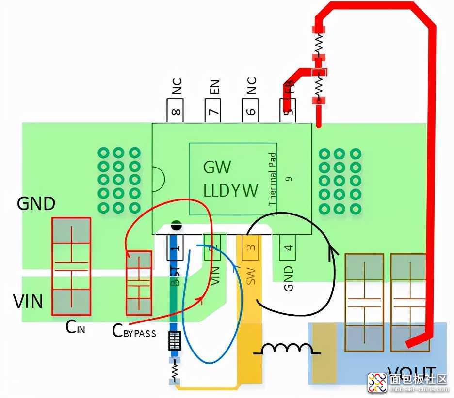 • 對于BUCK芯片而言,要想使輸入環路盡可能小,電感要靠近芯片SW引腳放置