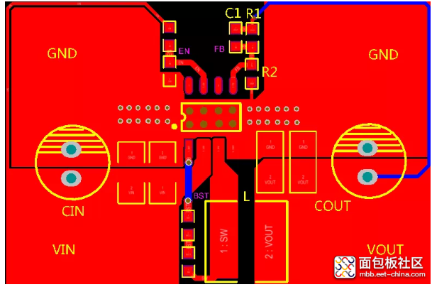 • FB的分壓電阻要從VOUT上進行采樣,采樣點要靠近輸出電容處才能獲得更準確的實際輸出電壓值