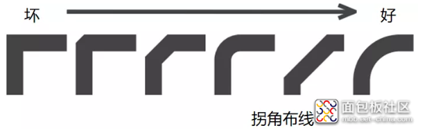 • 如果將拐角布線彎成直角,轉角處的阻抗就會發生變化