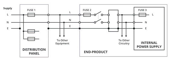 通過有線 AC 連接到機箱連接器的內部電源必須在入口處包括合適的單保險絲或雙保險絲(視情況而定)。請記住,最終產品交流保險絲保護上游電纜和連接,而不是內部電源,以防止短路和過載。當然,它必須通過正常運行電流并留有一定的浪涌余量,但它也應該在機箱連接器和電源之間對地短路后保險絲斷開之前進行額定,以使連接到最終產品的外部交流電纜不會過載供應。即使外部電纜的額定電流非常高,保險絲的分斷值也應低于任何上游保險絲或斷路器,以避免導致多個電路斷開的故障,即正確的保險絲“協調” - 一個關鍵問題在專業環境中(圖 2)。