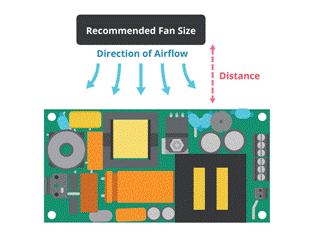 冷卻考慮很重要;內部電源可以是風扇、自然對流或底板冷卻,具體取決于最終產品及其應用。在某些環境(例如醫療環境)中,出于噪音原因,或者在難以更換的應用中,可能會排除風扇,但風扇冷卻電源通常會比其他類型的電源更小。如果選擇了風扇冷卻供應,則必須仔細確定進氣和排氣路徑以避免空氣“死角”,特別是如果有其他系統風扇在運行。CUI 等制造商在其產品的數據表中提供了推薦的氣流方向和風扇尺寸;在將電源設計到系統中時應考慮這些因素(圖 3)。