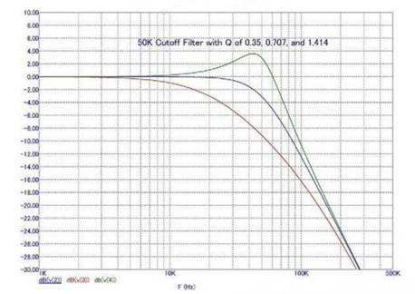 當Q值為》 0.707時,輸出濾波器將出現峰值,不同Q值下輸出濾波器的典型頻率響應見下圖。