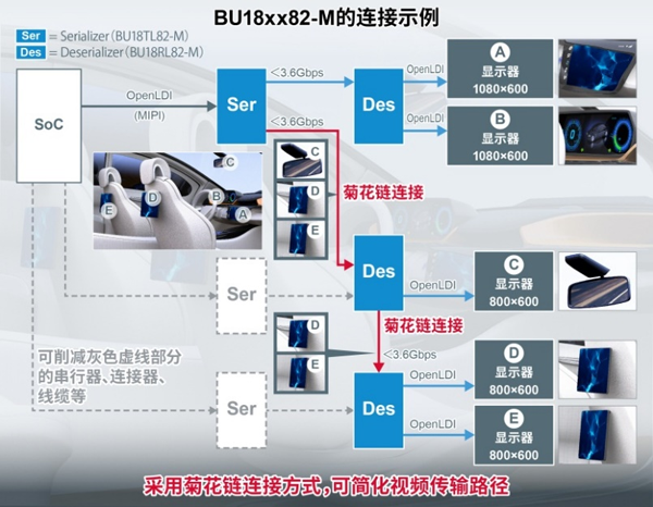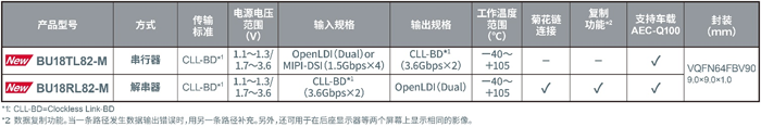 新產品“BU18xx82-M”符合汽車電子產品可靠性標準AEC-Q100,可確保車載應用所需的高可靠性。另外,串行器“BU18TL82-M”支持輸入接口OpenLDI和MIPI-DSI,因此適用于各種SoC。