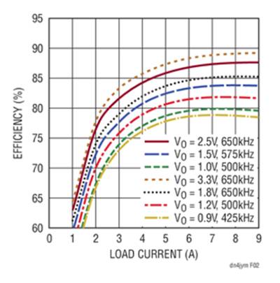 圖1顯示了典型的LTM4675應用。輸入電壓范圍為5.75V至17V,輸出為1V / 9A和1.8V / 9A。圖2顯示了LTM4675各種輸出電壓對負載電流的效率。LTM4675可以在很寬的工作范圍內實現高效率,并具有高可靠性。圖3顯示,當模塊在12V輸入,1V / 9A和1.8V / 9A輸出下運行時,外殼溫度為84.1°C,無氣流。