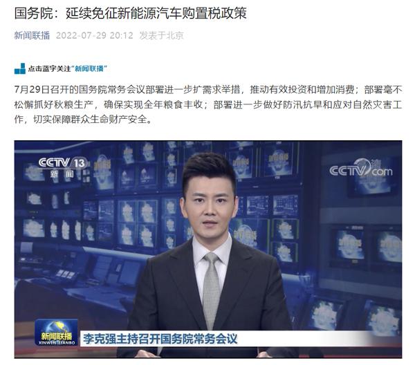 據(jù)新聞聯(lián)播官微消息,7 月 29 日召開的國務(wù)院常務(wù)會議指出,除個別地區(qū)外,限購地區(qū)要增加汽車指標數(shù)量、放寬購車資格限制。打通二手車流通堵點。延續(xù)免征新能源汽車購置稅政策。