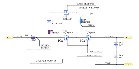 SQJQ160E汽車用N溝道MOSFET并聯連接,使得通路阻抗最小化,以降低功耗。在200A工作條件下,可將總功耗限制在10W以內。