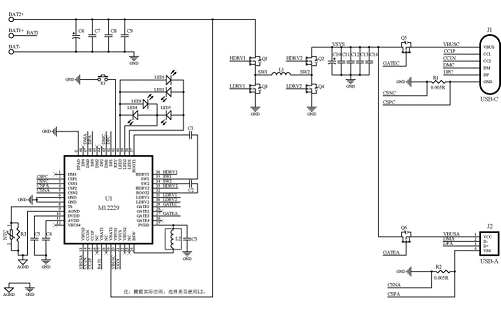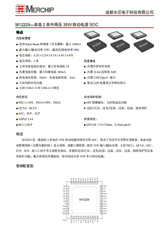 水芯 M12229 支持PD3.1、QC3.0、AFC、FCP、SCP、BC1.2DCP等主流快充協議,并提供過壓/欠壓、過充/過放、過溫、過壓、過流、短路保護等完備的保護功能。配合簡單的外圍電路,即可組成雙串35W多口移動電源。