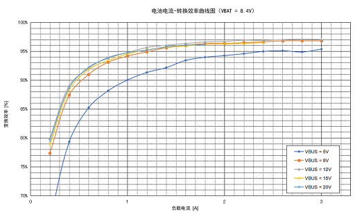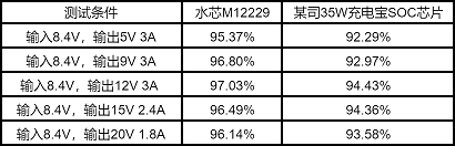 上圖為水芯 M12229 在 8.4V 輸入時,輸出5V、9V、12V、15V、20V的輸出效率曲線。水芯 M12229 刷新了35W升降壓充電寶的效率記錄。由于集成了高效率的DC-DC電壓變換器和多種補償電路,M12229的最大放電效率可達97%+,比競品方案高3%以上,效率表現業界領先。