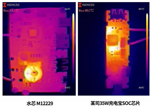 下圖為水芯 M12229 與某司35W充電寶SOC芯片的熱成像對比圖,某司35W充電寶SOC芯片輸出35W的最低輸入電壓為6.3V(放電截止電壓精度不準),因此6.3V輸出15V2.33A的溫度,溫度高達89.7℃。