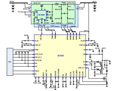 12 V 鉛酸電池,兩側是 48 V 鋰電池以啟動發(fā)動機。因此,需要根據(jù)整個系統(tǒng)的特定需求在兩個電池之間雙向傳輸電力。