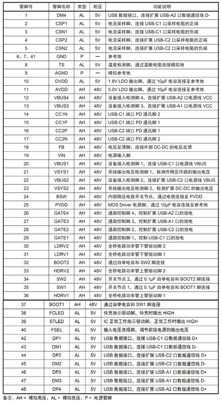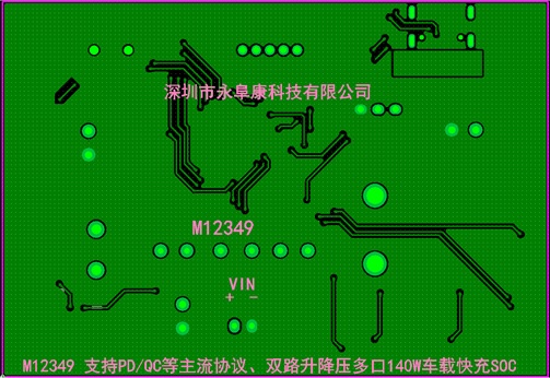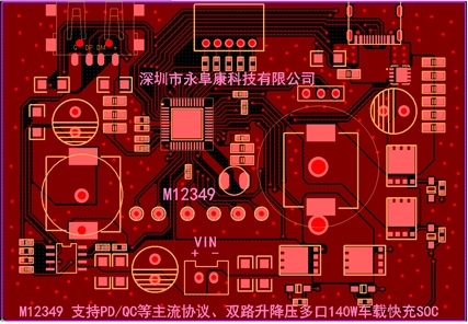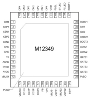 M12349是一款面向大功率快充應用的電源管理 SOC,集成了微處理器、升降壓變換器、快充協議控制器,支持 PD3.1、QC3.0、SCP、FCP、AFC、BC1.2 DCP等全部主流快充協議,結合少量元件即可組成單C口的140W大功率快充解決方案;輔以DC-DC芯片,還可擴展為雙路獨立的C+CAA多口大功率快充解決方案。采用QFN-48封裝