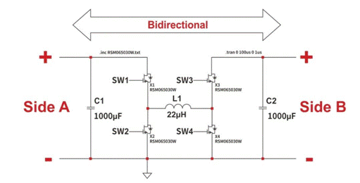 圖一顯示了簡單但功能齊全的電氣圖,其對稱配置可讓用戶選擇四種不同的工作模式。它由四個級聯降壓-升壓轉換器的單相象限組成,包括四個開關、一個電感器和兩個電容器。根據不同電子開關的功能,電路可以降低或升高輸入電壓。開關元件由碳化硅MOSFET RSM065030W組成,當然也可以用其它器件代替。