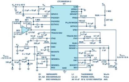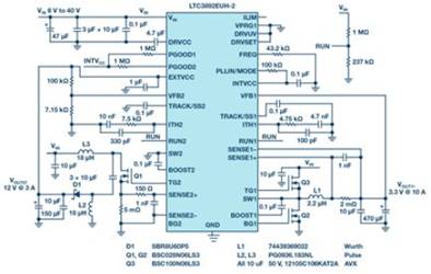 圖1. LTC3892的電氣原理圖,可產生正負電壓。VOUT1為10 A、3.3 V,VOUT2為3 A、-12 V。