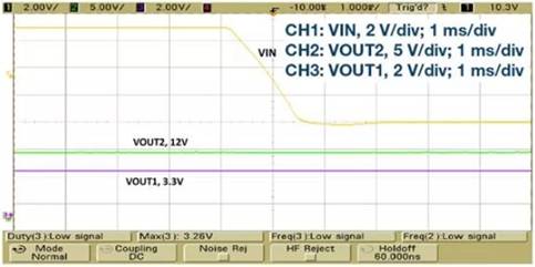 圖4. 軌電壓從14 V降至7 V,VOUT1和VOUT2均處于穩壓狀態。