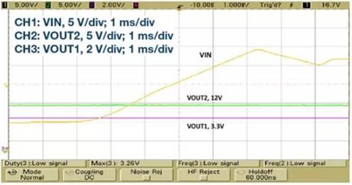 圖5. 軌電壓從14 V升至24 V,但VOUT1和VOUT2均處于穩壓狀態。