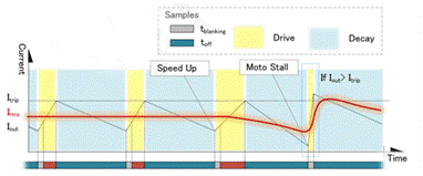 NSD731x可提供3.6A峰值電流,520m Ohm HS + LS 導通電阻,采用慢速衰減模式且支持PWM電流調制功能。如圖2所示,在電機啟動過程或者負載出現較大電容時,PWM電流調制功能可有效減小峰值電流,降低由于過大瞬態電流而對系統造成的沖擊。