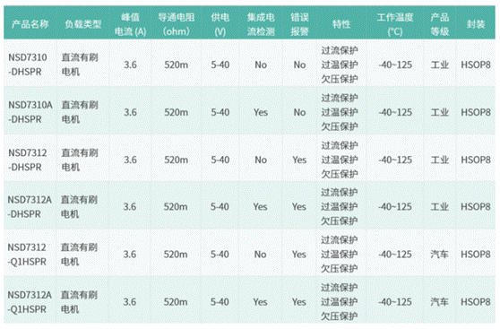 納芯微全新推出NSD731x系列直流有刷電機驅動芯片,該系列產品包括NSD7310, NSD7312, NSD7310A, NSD7312A, NSD7312-Q1, NSD7312A-Q1等多款芯片,可廣泛適用于掃地機、家電、直流有刷電機模組、新能源汽車等多種應用場景。