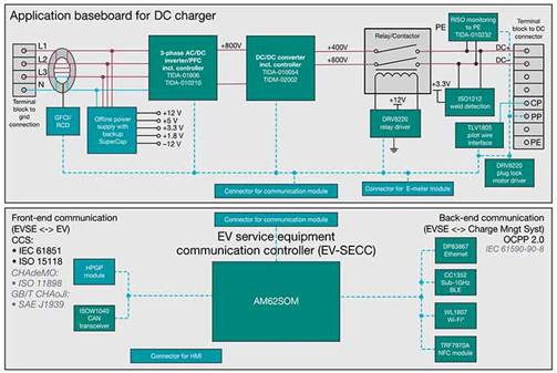 未來的電動汽車有望成為能源來源,即在用電高峰或停電期間將存儲的電能返回電網。管理這種潛在的能量交換是電網集成的一個方面,這使得通信成為電動汽車充電站的一項關鍵設計考量。無論是車輛充電點到電網,還是充電站到云端,前后端通信設計都必須滿足充電過程中的數據、功能安全與信息安全標準,如圖 1 所示。