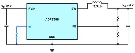 圖 1. ADP2386 降壓變換器,其開關頻率由電阻 RT 設置。