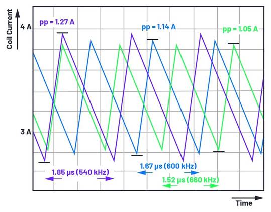 圖2顯示了開關頻率對電感電流紋波的影響。圖中,600 kHz的標稱開關頻率以藍色顯示。最小(540 kHz)開關頻率以紫色顯示,最大(660 kHz)開關頻率以綠色顯示。在600 kHz的標稱設置頻率下,當穩壓器在540 kHz頻率下開關時,可以看到峰峰紋波電流為1.27 A。但是,在600 kHz的相同頻率設置下,開關穩壓器也能夠在660 kHz頻率下開關,相應的紋波電流為1.05 A。在此例中,220 mA的線圈電流紋波差異可能是由于電路中不同組件的開關頻率變化導致的。這已經超過了整個允許的溫度范圍