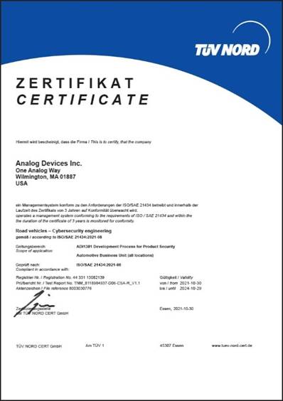 ADI公司預料到了ISO/SAE 21434標準在草案期間解決的核心網絡安全問題,并在wBMS設計和開發過程中采納了相關應對措施。目前,ADI是首批在政策和流程方面實現ISO/SAE 21434合規性的技術供應商,ADI wBMS技術正在接受最高網絡安全保障等級認證。 |