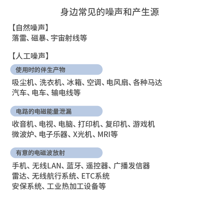 噪聲分為自然噪聲和人工噪聲。自然噪聲的產(chǎn)生源是落雷、空中放電、宇宙射線等。人工噪聲的產(chǎn)生源是電子設(shè)備。電子設(shè)備分為廣播發(fā)信器等有意發(fā)射電磁波的類型、收音機(jī)和電視等從內(nèi)部泄漏電磁能量的類型,以及電動(dòng)清掃機(jī)和工具等使用時(shí)會(huì)隨之產(chǎn)生電磁波的類型。