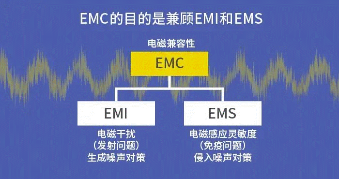 因此電子設(shè)備就同時(shí)需要具備防止自身產(chǎn)生噪聲的EMI (電磁干擾:Electro Magnetic Interference) 對(duì)策和防止自身受到影響的EMS (電磁敏感性: Electro Magnetic Susceptibility) 對(duì)策。這就叫做EMC (Electromagnetic Compatibility),即電磁兼容性。簡(jiǎn)單來(lái)說(shuō),就是需要同時(shí)采取措施應(yīng)對(duì)Emission (發(fā)射) 問(wèn)題和Immunity (免疫) 問(wèn)題,即應(yīng)對(duì)生成噪聲和侵入噪聲,兼顧兩方面的方案就叫做EMC。
