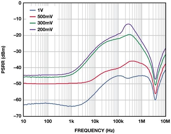 LDO 電源抑制比(PSRR)與裕量電壓相關——裕量電壓指輸入與輸出電壓之差。對于固定裕量電壓,PSRR隨著負載電流的提高而降低,大負載電流和小裕量電壓條件下尤其如此。圖1所示為ADM7160超低噪聲、2.5V線性調節器在200mA 負載電流和200mV、300mV、500mV 和1V 裕量電壓條件下的PSRR。隨著裕量電壓的減小,PSRR也會減小,壓差可能變得非常大。例如,在100kHz下,裕量電壓從1V 變為500 mV,結果將使PSRR減少5dB。然而,裕量電壓的較小變化,從500mV 變為300mV,結果會導致PSRR下降18dB 以上。