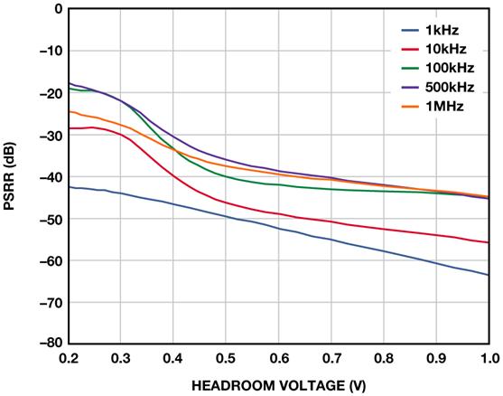 在低裕量工作模式下,需要考慮裕量電壓對PSRR的影響,否則,會導致輸出電壓噪聲水平高于預期。如圖3 所示的PSRR與裕量電壓關系曲線通常可在數據手冊中找到,而且可以用來確定給定條件下可以實現的噪聲抑制量。