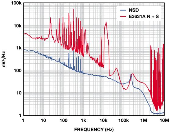 圖4 展示的是2.5 V ADM7160在500 mV裕量和100 mA負載條件下,相對于E3631A臺式電源的輸出噪聲,該臺式電源在20 Hz至20 MHz范圍內的額定噪聲低于350 μV-rms。1 kHz以下的許多雜散為與60 Hz線路頻率整流相關的諧波。10kHz以上的寬雜散來自產生最終輸出電壓的DC-DC轉換器。1 MHz以上的雜散源于環境中與電源噪聲不相關的RF 源。在10Hz至100kHz范圍內,這些測試所用電源的實測噪聲為56 μVrms,含雜散為104μV。LDO抑制電源上的所有噪聲,輸出噪聲約為9 μV-rms。