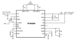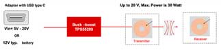同樣,TPS55289也適用于無線充電,下圖是該應用的示例框圖。TPS55289的頻率能夠達到2MHz,使得開發者可以使用更小的外圍器件完成設計,從而減小整體解決方案的尺寸,并且節省BOM成本。此外TPS55289支持I2C協議,可以通過I2C調節輸出電壓。