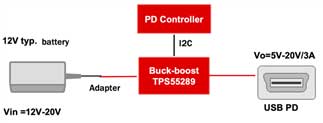 下圖所示的是TPS55289在USB PD中的應用框圖,它能夠滿足USB PD標準協議,可通過I2C實現與PD控制器的通信。并且,它有著極高的能量轉化效率,在輸入12V、輸出20V/3A的條件下,效率能夠達到96%。TPS55289還是一款四管集成的buck-boost,能夠在很大程度上節省板級空間,非常適用于個人電子產品的小型化設計。
