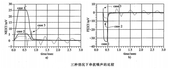下圖顯示了三種情況下串擾波形,無論是近端串擾還是遠端串擾,走線間距從1w增加到3w時,串擾都明顯減小。在此基礎上,走線間插入保護地線,串擾如下圖中Case 3所示,相比Case 2,插入保護地線,不但沒有起到進一步減小串擾的作用,反而增大了串擾噪聲。