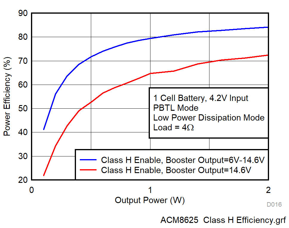 下圖藍(lán)色和紅色是CLASS H這個(gè)功能打開(kāi)和關(guān)閉在小功率的效率對(duì)比。